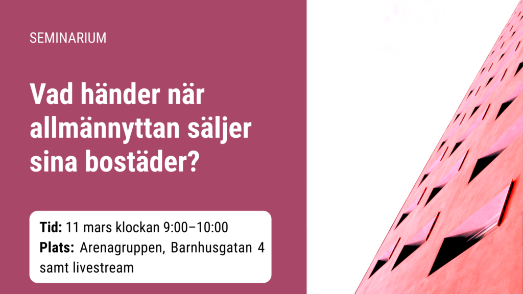 Välkommen till rapportlanseringen av ”Vad händer när allmännyttan säljer sina bostäder? – Erfarenheter från Örebro, Gävle och Eskilstuna”, som tar sin utgångspunkt i vad som hänt i tre städer efter att hyresrätter sålts från allmännytta till privata bolag. Vi får också höra exempel från Stockholm – där staden köpt tillbaka hyresrätter i Järva. En diskussion om hur allmännyttan kan stärkas för att alla invånare ska ha chans till ett bra och tryggt boende till rimliga hyror.